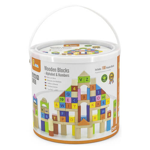 Features both natural and painted blocks with uppercase letters, numbers and basic maths functions. 100 Pieces. Largest block measures 6(W)cm.