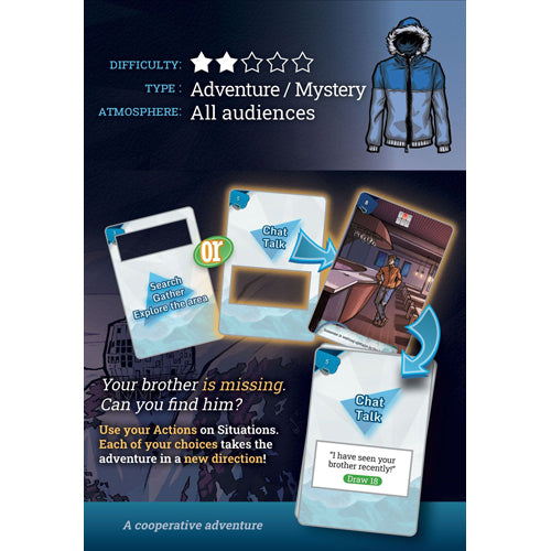 Backstories is a game with mechanisms as simple as they are revolutionary: a bit like you would do in a Point & Click video games, interact with your environment as you progress through your thrilling adventures. Some cards (Panorama) represent the environment in which you’re evolving. Other cards (Actions) are perforated, and represent the actions you can perform (Talk, Search, Objects in your possession, etc.). To interact, all you have to do is place a perforated card on the back of the Panorama card you’re interested in, then turn the card over and read the result of your choice.