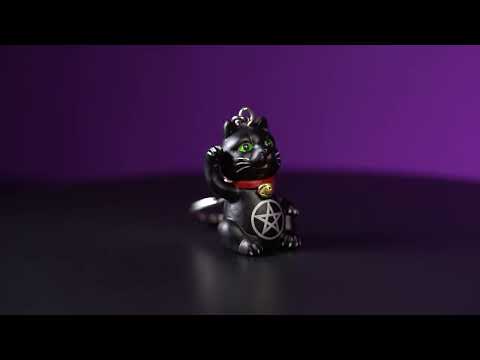 • Features vibrant green eyes, a golden bell and pentacle design on a traditional keychain ring