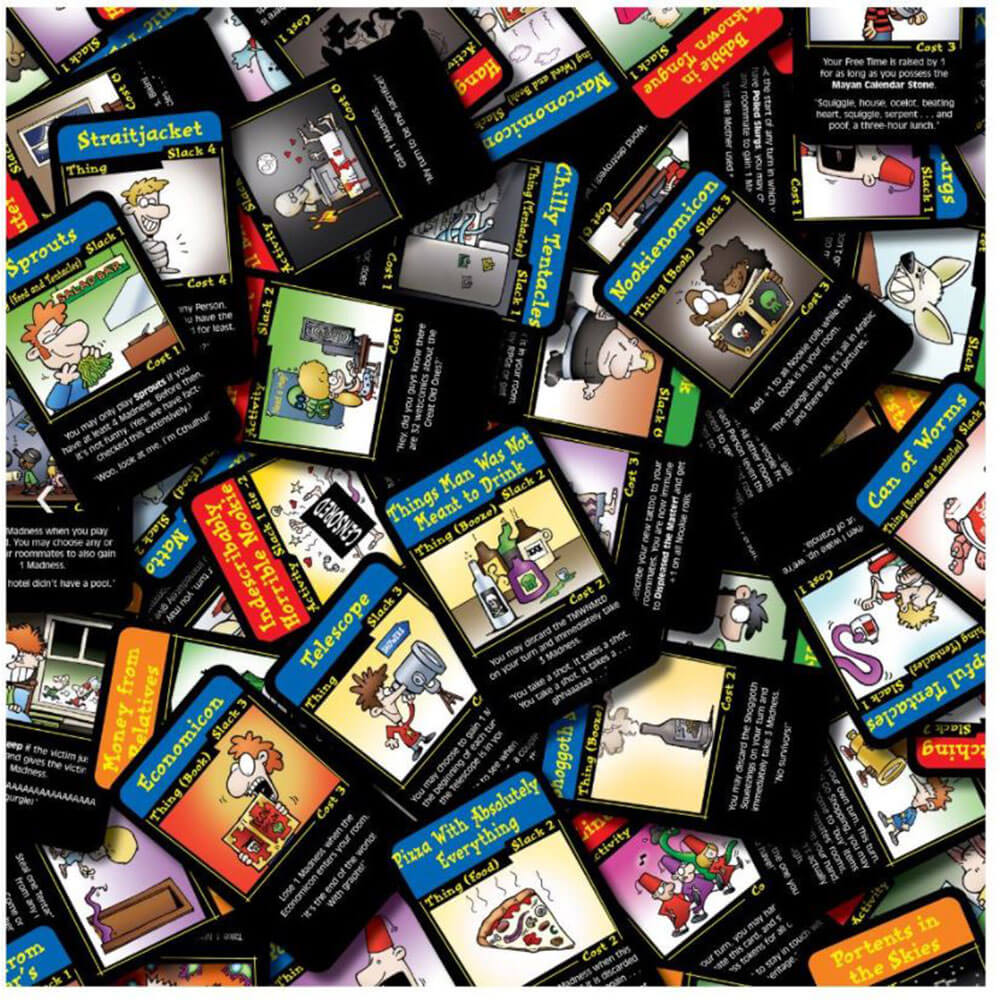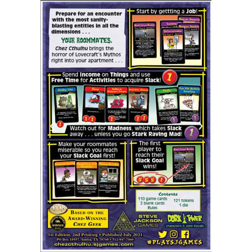 • Chez Cthulhu includes everything you need to play, right out of the box: cards, tokens for Slack and Madness, and dice.