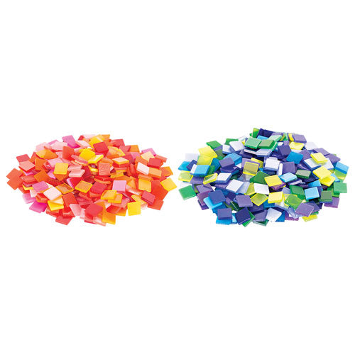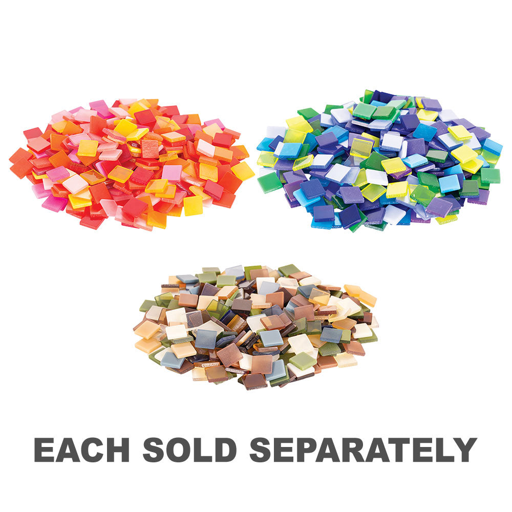 • This pack of Deco Mosaic Tiles includes a mix of warm colours (yellows, oranges, pinks, crimson and reds), in four surface finishes (opaque, frost, clear and glossy) which create glass-like effects.