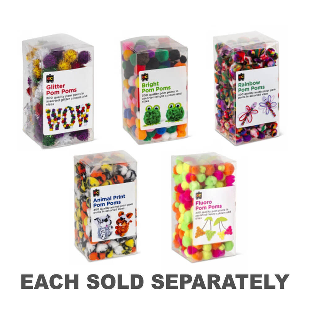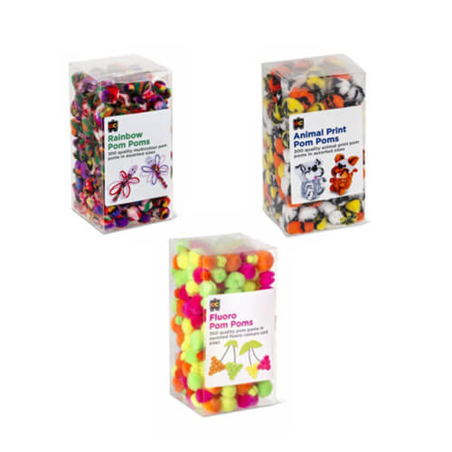 Pom Poms are fun for lots of crafty things, making Christmas stockings or just playing with them. These bright and fluffy Pom Poms will add a 3D effect to any craft activity. Assorted fluoro colours and sizes in a box of 300.