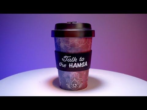 • Matching black anti-spill lid and protective silicone band with punny phrase 'Talk to the Hamsa'.