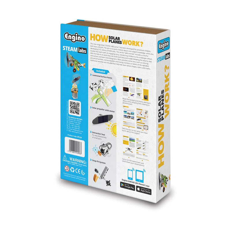 Solar Energy Science Kit Kids learn all about the amazing possibilities of solar energy and the benefits of eco thinking while building actual solar-powered models and discovering what makes them work with this hands-on STEAM toy set.When they're done experimenting, kids can take off their hard hats and pick up their coloured pencils and decorate their very own snap-on skins. Plus, young learners will get a colour booklet with: a micro-history of renewable energy with quirky ecofacts fun STEM experiments with their solar-powered helicopter the easy-to-master theory behind solar energy an introduction to alternative green energies a quiz to test their understanding of key STEM concepts easy-to-follow building instructions printable skins to practice their design skills.Number of parts included in pack: 65For ages 8-12+