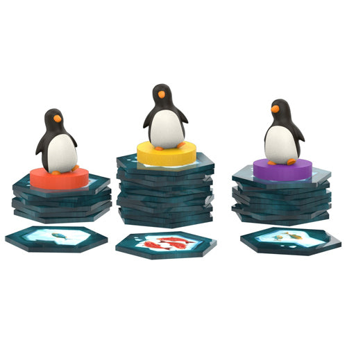In Hey, That's My Fish!, players want to catch as many fish as possible with their waddle of penguins. Each turn, a player moves one penguin in a straight line over hex-shaped ice tiles with 1, 2 or 3 fish on them. The player then collects the hex from where the penguin started its movement from the table, thereby creating a gap which penguins can't cross on future turns. When a penguin can't move, it's removed from play with its owner claiming the tile on which it stands. The player who collects the most fish wins.