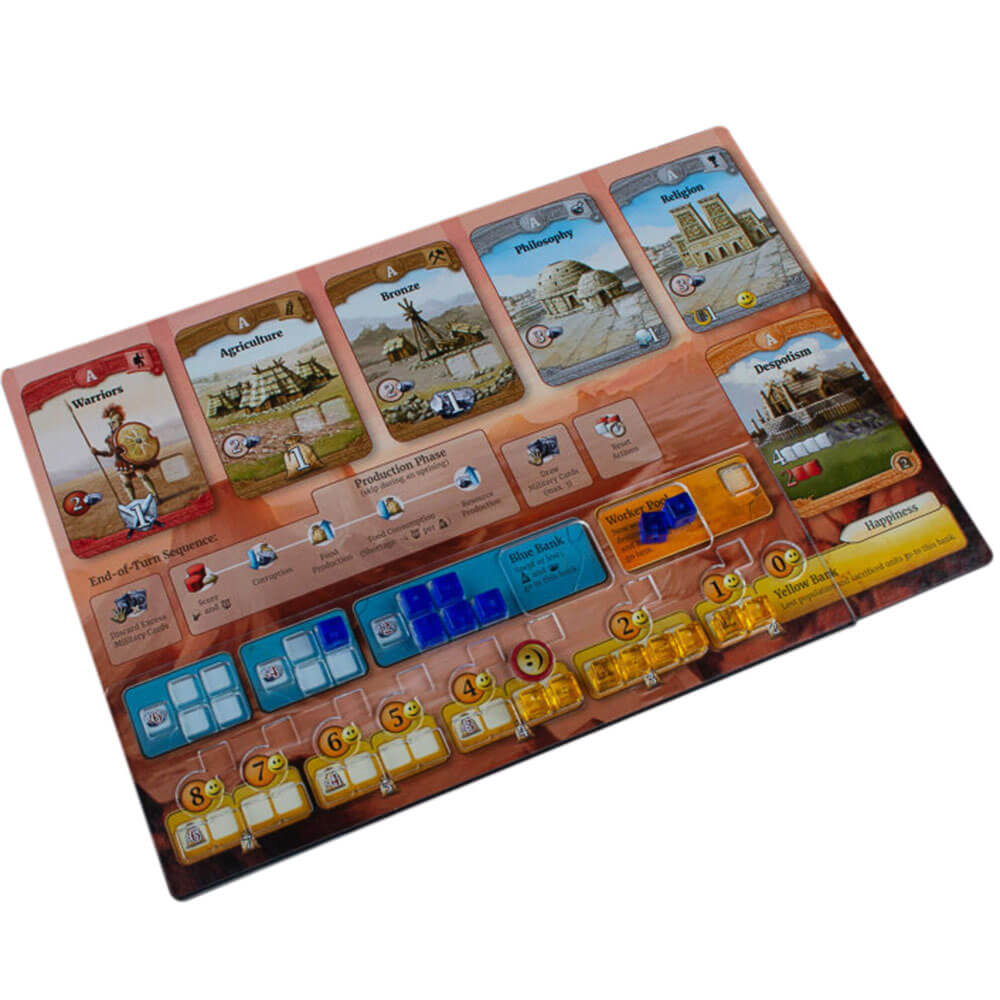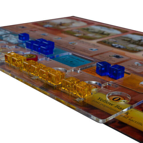 Wander through the Ages and make sure, your cubes and workes are have a firm ground. Our overlay designed to fit the new edition from Czech Games will make sure, that all cubes stay in place. It will fit inside our Through The Ages Organizer.
