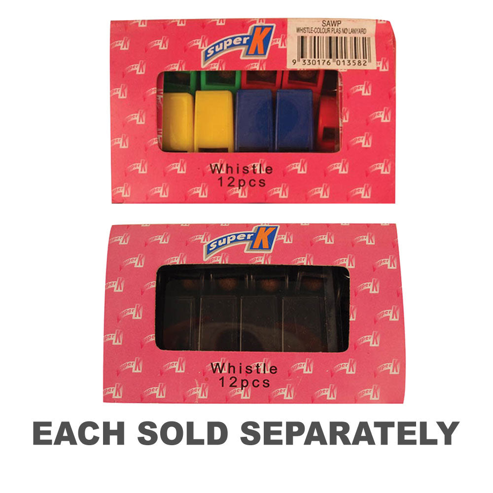 • Large coloured plastic whistles with pea