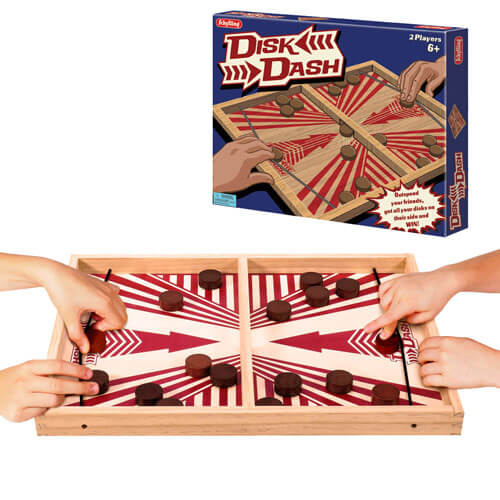 It's fast, Furious, frantic fun in a head to head challenge as you try to shoot all your disks through the gate to your opponent's side of the board Pull back the elastic and sling Shot your solid wooden disks through the opening, first to get all their disks through is the winner