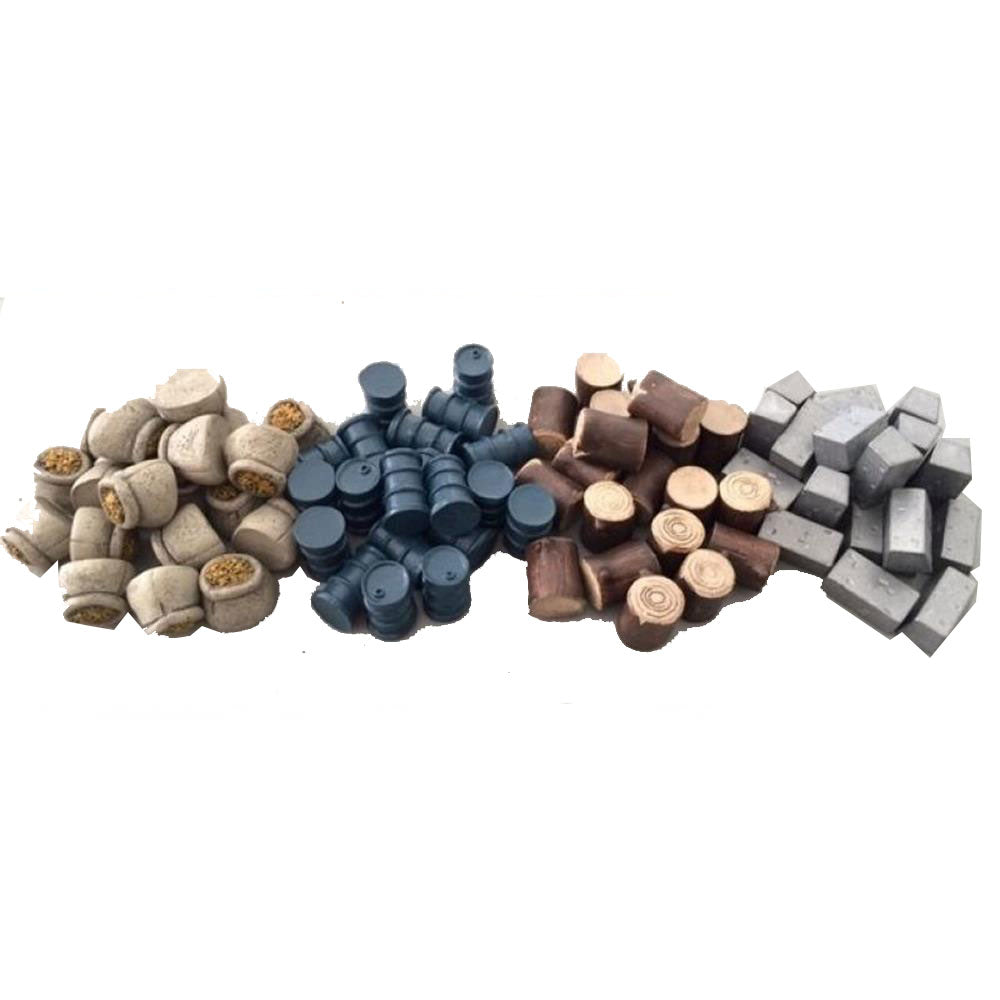 - Included are 80 tokens: 20 Grain sacks (food), 20 Iron ingots (metal), 20 Oil barrels (oil), 20 Chopped wood (wood)