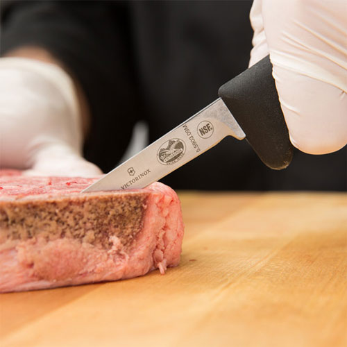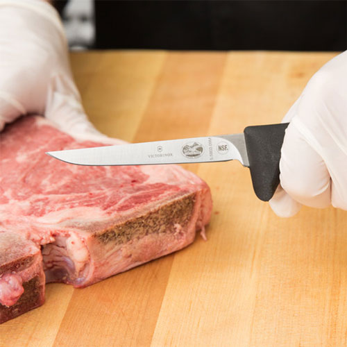 This knife is designed to cut meat from off the bone without wasting meat and is also great for cutting fat from the meat with precision. Its blade is designed to withstand constant use over time without rusting or corroding so you can count on this knife in your commercial kitchen. Make deboning your poultry a simple task with this boning knife!