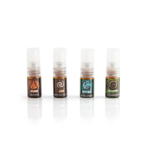 • 4 mélanges d'éléments et d'huiles essentielles : feu/orange, eau/bergamote, air/eucalyptus citronné, terre/bois de cèdre.