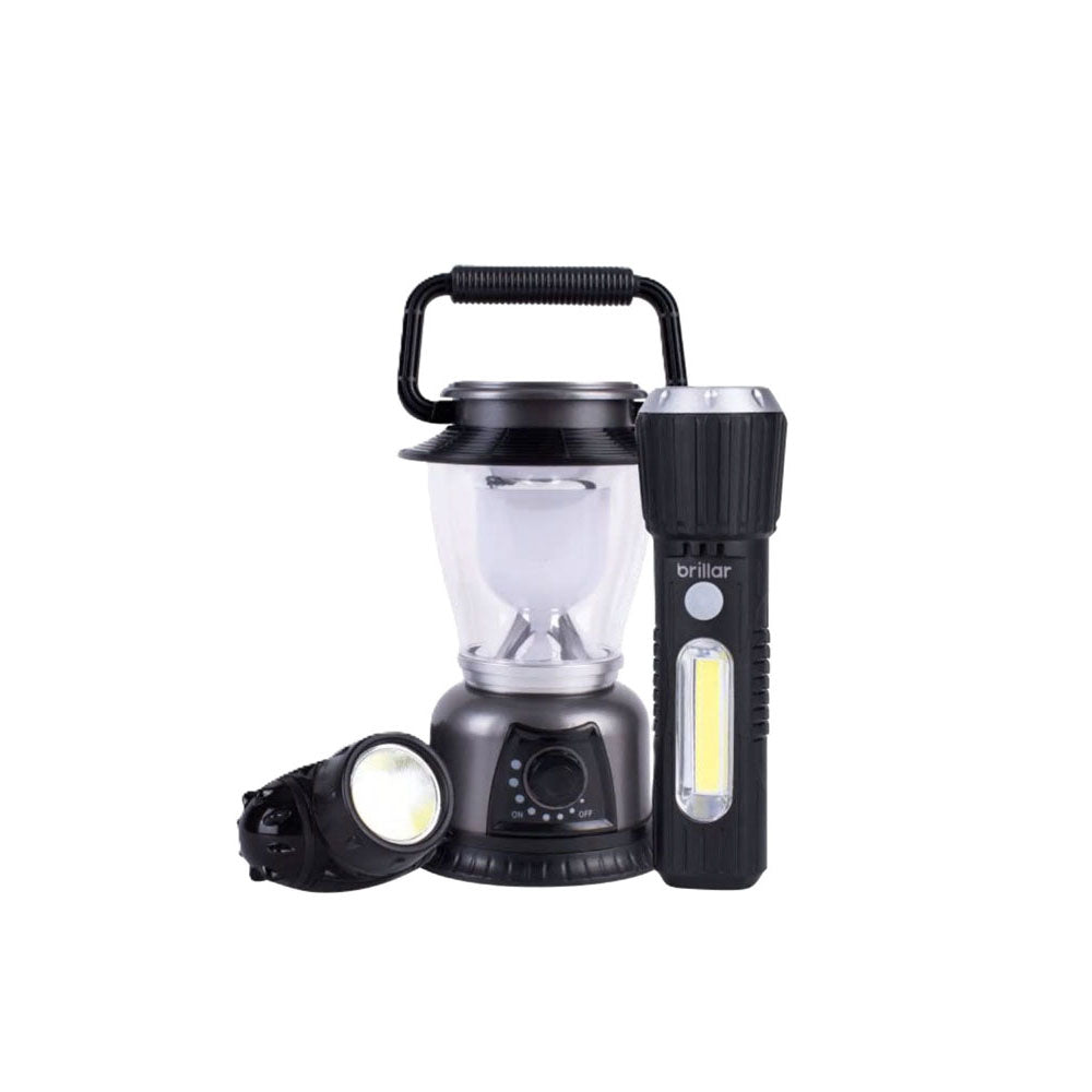 3 pack of lighting for all occasions. Includes a torch, headlamp & lantern. Camping Lamp - 260 lumens, 3 mode headlamp - 180 lumens, Flashlight - 200 lumens. IPX4 weather resistant. AAA batteries included.