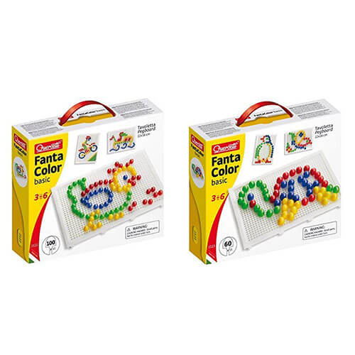 - Fantacolor Basic: âge recommandé 3-6 ans, contient 60 pièces ou 100 pièces en 4 couleurs et 1 panneau perforé. AVERTISSEMENT: étouffement Hazard, ce modèle n'est pas pour les enfants de moins de 3 ans