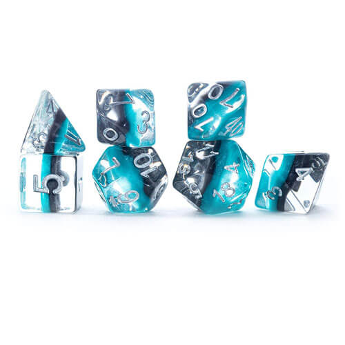 • Couleurs : Midnight Black & Dreams of Teal - Numérotation argentée. Les dés Eclipse sont des dés superposés (4) comportant deux fines couches de couleur nacrée brillante nichées entre deux couches extérieures transparentes parfaitement claires !