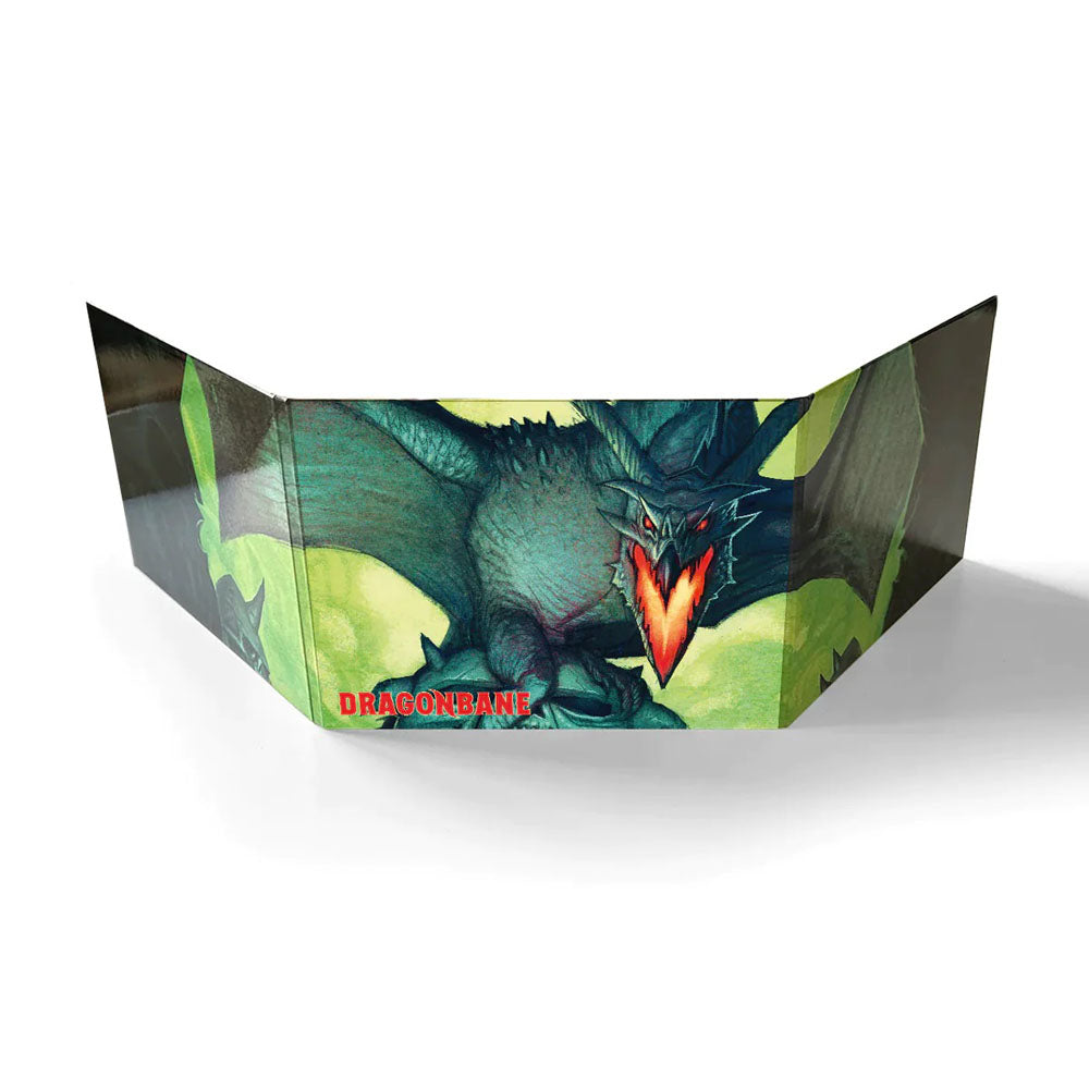 Un écran de jeu de luxe au format paysage pour le RPG de Dragonbane. Il présente le bel art de Johan Egerkrans à l'extérieur et une multitude de tables utiles et d'informations importantes à l'intérieur, tout en gardant les plans de Gamemaster cachés aux yeux des joueurs curieux.