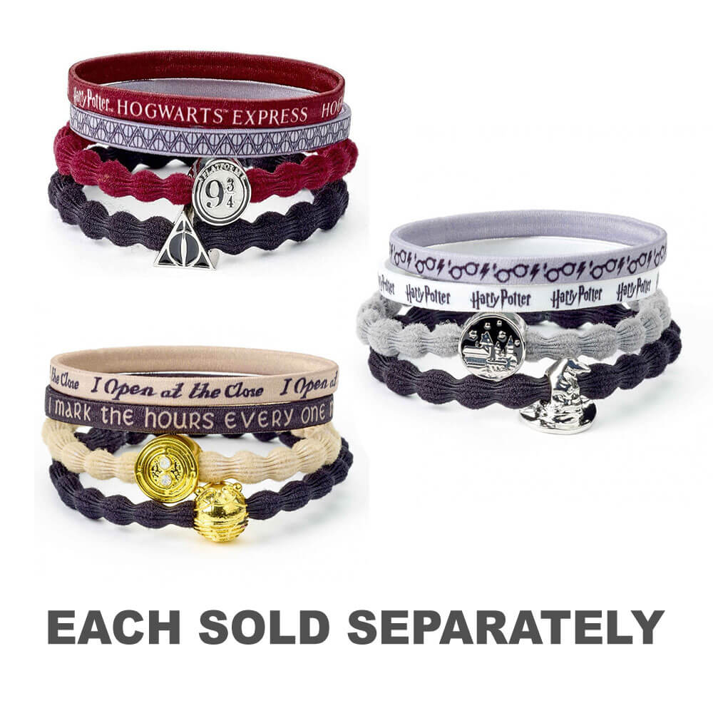 Deux parties essentielles de l'histoire de Harry Potter sont présentées sur cet ensemble de bandes à cheveux. Platform 9 3/4 à la gare de Kings Cross, où le voyage commence, et les reliques mortelles de la mort, ne contrôlées sciemment que par Harry Potter.