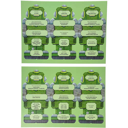 • Le robot se compose de cinq tuiles, une tuile avec des règles pour chaque phase plus une capacité spéciale, que le robot utilise pendant le jeu.