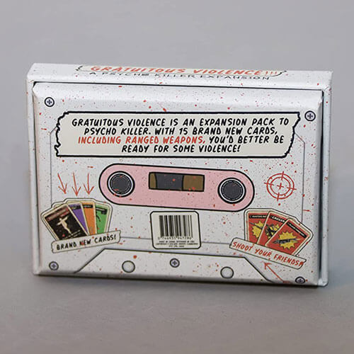 Gratuitous Violence se joue comme Psycho killer, mais lorsque vous êtes attaqué, vous pouvez jouer les nouvelles cartes Arme à distance dans les piles de blessures des autres joueurs, au lieu des vôtres ! Avec des amis comme eux, qui a besoin de Psycho Killers ?