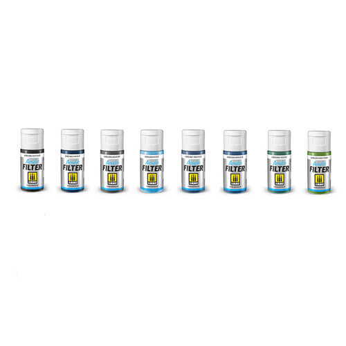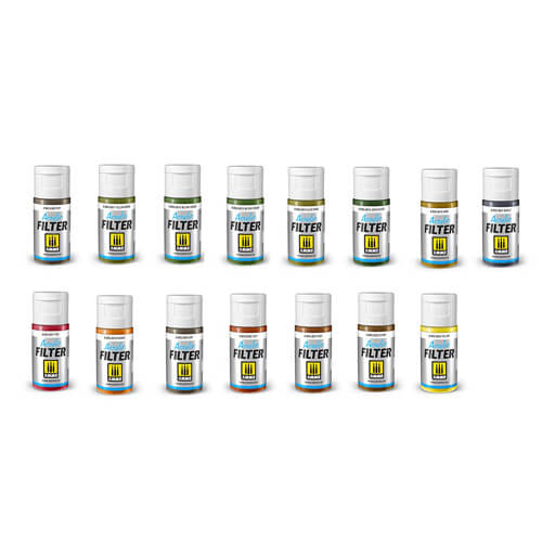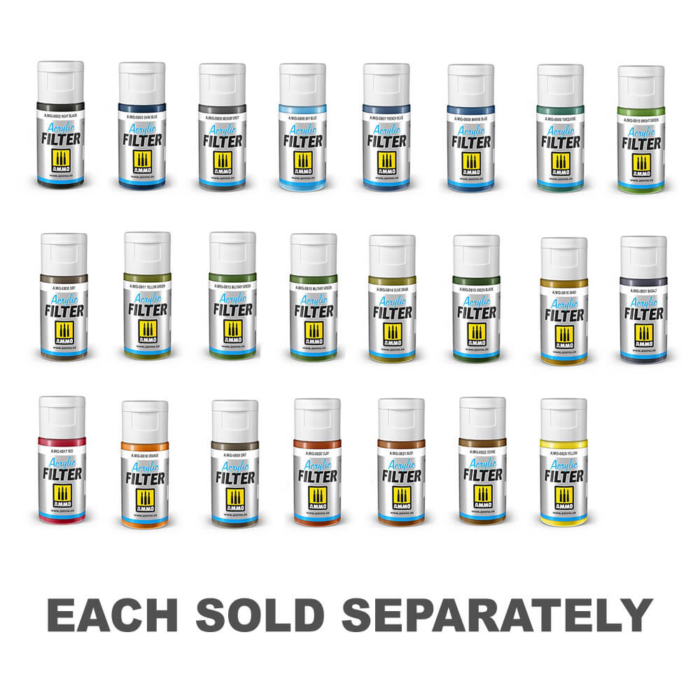 Les nouveaux filtres acryliques des munitions sont conçus pour être appliqués directement au modèle. Cette nouvelle gamme vous permet d'ajouter une variation de couleur à vos miniatures, d'harmoniser diverses couleurs de camouflage ou de distinguer les zones avec un ton différent. Le filtre acrylique peut être facilement appliqué avec une brosse, ce qui évite le besoin de masquage compliqué. Humidisez la brosse avec le produit et appliquez-la sans inonder la surface. Grâce à la formulation innovante, les filtres acryliques peuvent être retouchés ou éliminés simplement et facilement avec de l'eau pendant le temps sec prolongé, chaque filtre sèche complètement en 24 heures. Ces filtres polyvalents peuvent également être appliqués par aérographe pour un nombre infini d'effets. Grâce à la large gamme de 30 couleurs disponibles, vous n'aurez pas besoin de fabriquer des mélanges complexes, de vous ajuster pour le rapport d'amincissement approprié ou de régler le ton à l'ombre prévue. Chaque couleur peut être mélangée les unes avec les autres ou teintée avec d'autres acryliques de munitions. Les filtres acryliques peuvent être dilués et nettoyés avec wat
