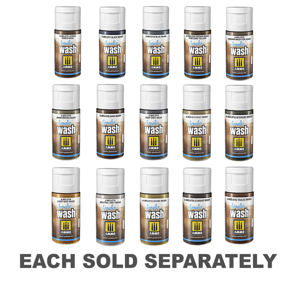 Les lavages sont l'une des techniques de modélisation les plus anciennes et les plus essentielles, utilisées par tous les modélistes sur les sujets et les dioramas de tous types et thèmes. Développé avec deux formulations différentes pour inclure à la fois le type d'émail et le type acrylique. Chaque type présente des qualités différentes pour s'adapter à la variété des besoins de nos modèles et aux préférences de la demande de chaque modélisateur. Les deux offrent d'excellents résultats et sont très faciles à appliquer. L'avantage du lavage acrylique est qu'il n'a ni toxicité ni odeur, donc l'utiliser à la maison ou près de votre famille n'est pas un problème, et il sèche plus rapidement que le lavage en émail qui vous permet de terminer le processus dans une quantité plus courte de temps valorisé . Le lavage acrylique est disponible dans une bouteille avec un capuchon de dosage qui vous permet de placer quelques gouttes sur une palette ou un récipient pour une utilisation ultérieure. Bien que la capacité de la bouteille soit de 15 ml, le distributeur vous permet d'économiser des produits et de travailler avec plus de précision. Ces nouveaux lavages sont disponibles dans une large gamme de couleurs afin que vous puissiez avoir toutes les options pour votre