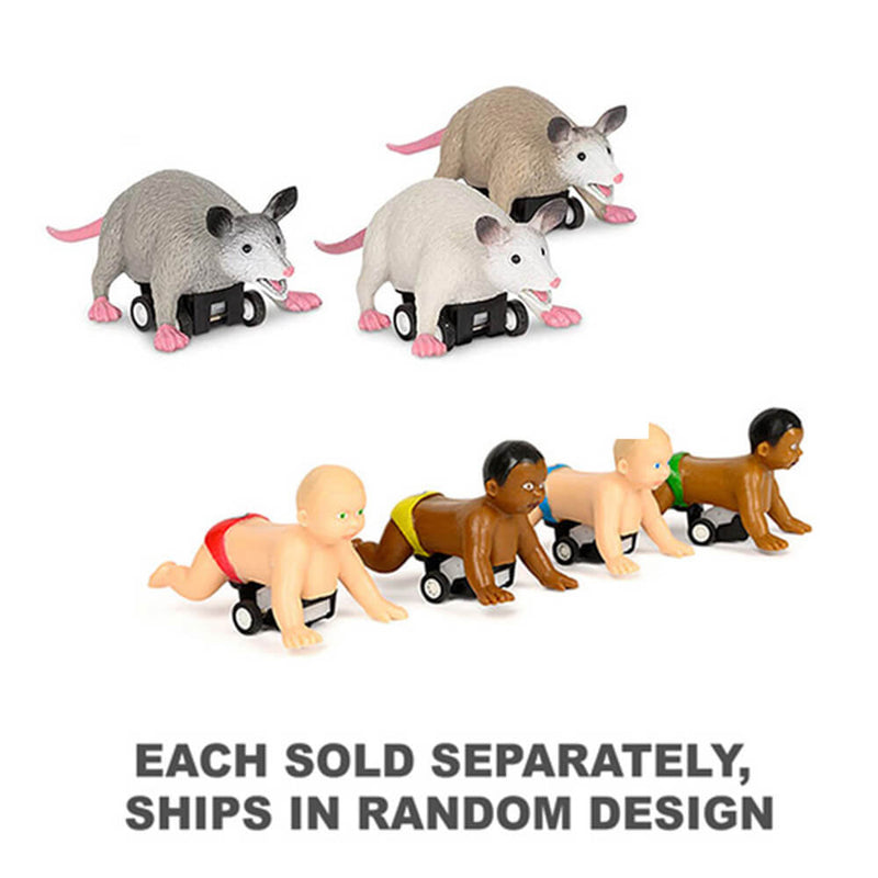 Deze racevatums hebben een opgevoerde, pull-back, 4-wielige versie van het opossum dat is gebouwd voor snelheid. Of ze nu door je afval graven, tikken eten van een hert of sleepraces in het steegje achter je plaats, deze 3-3/4 "(9,5 cm) zachte vinyl- en plastic titanen van afval racen zich echt een weg naar je hart .