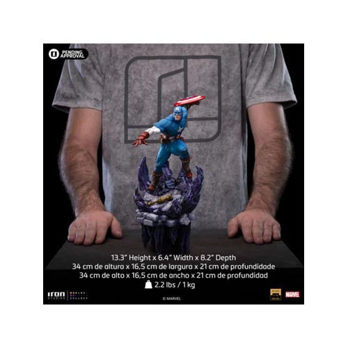 Klaar om zijn bijna onverwoestbare schild te gooien, gemaakt met een vibranium-metaallegering, gebruikt zowel voor verdediging als aanval, dankzij de aerodynamische eigenschappen, die zijn aanvallende capaciteit in de machtige armen van het schildwacht van Liberty optimaliseren.