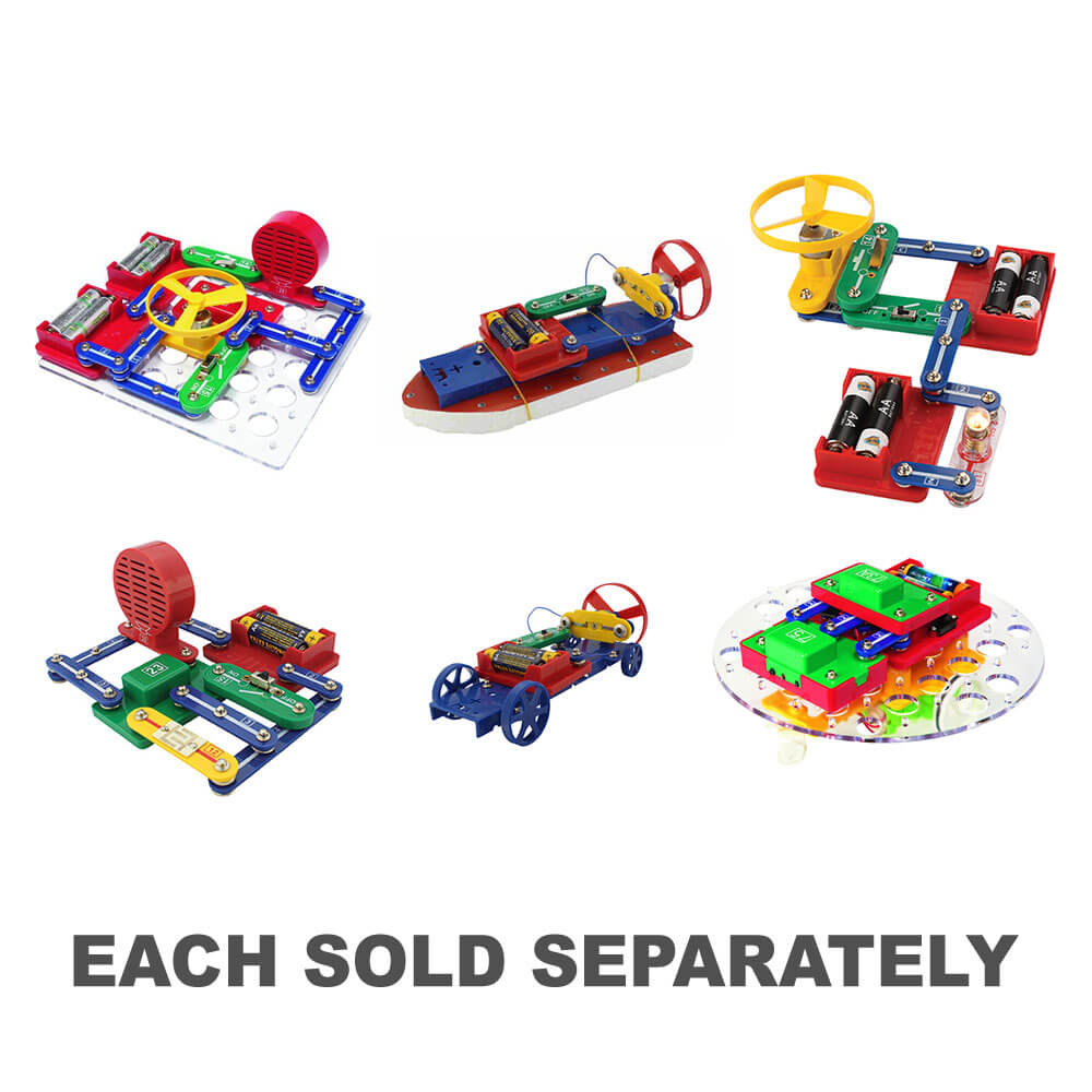Het clip-samenvoering eindigt daar niet! Kinderen kunnen ook genieten van het maken van modellen met werkende elektrische componenten zoals een airboat, helica -auto of een Intelliover. De modelstukken knippen samen, zodat u geen gereedschap of een soldeerbout nodig hebt om de circuits te maken die de modellen van stroom zetten!