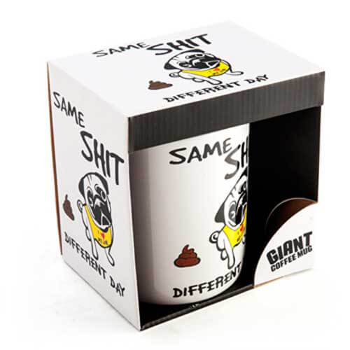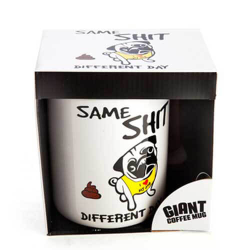 - Met een schattige kleine pug op een echte grote mok om je door een van die dagen door te komen