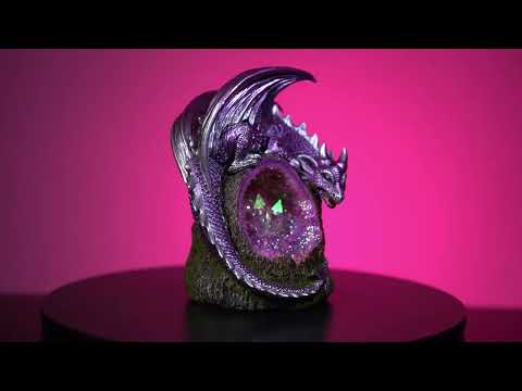 Magische achterstroom wierookbrander met een metalen paarse draak gekruld rond een boomstronk. Twinkelende geode omringt drie prominente kristallen. Gedetailleerd beeldhouwen en kleur. Het veranderen van LED's maken van deze brander een prachtig functioneel ornament.