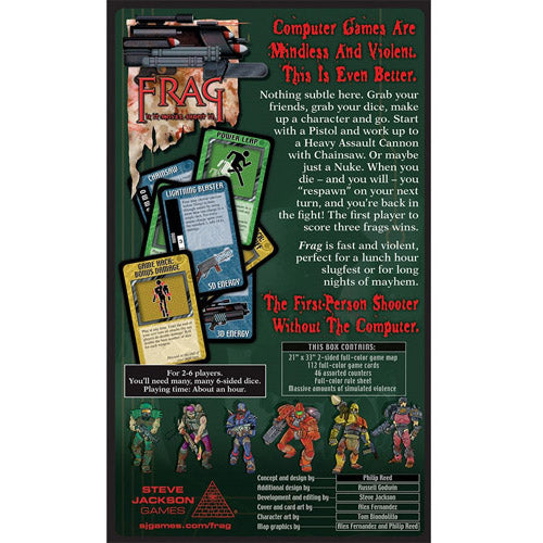 • Known for being easy to learn, fast-moving, and fun, Frag provides an exciting tabletop alternative to traditional computer-based first-person shooters.