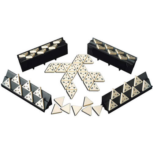 Het klassieke driehoekige Domino -spel. Scorepunten door cijfers te matchen op de driezijdige tegels met koperen spinners.