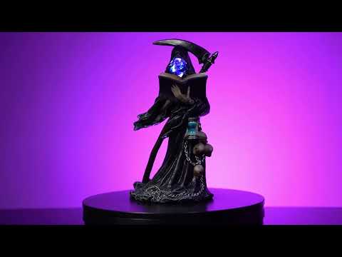 Mysterious Grim Reaper met een zeis en leidde lantaarn. Op een halve maan gemaakt van meerdere schedels. Gemaakt van stevige polyresin met een luxueus, zwaar gevoel.