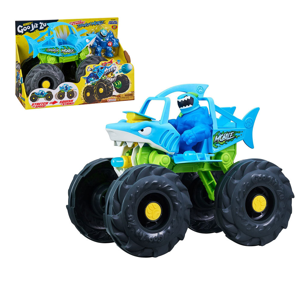 Met Thrash en zijn fantastische "Stretch and Strike" Thrash Mobile, maak je klaar om in de actie te rollen! Het heeft twee ongelooflijke modi en het is gevormd als een haai! In de "Speed -modus", duw naar beneden om de wielen eruit te verspreiden en mee te gaan. In "Strike Mode", trekt het chassis omhoog om een aanval te lanceren en raketten uit de kaken van de haai te schieten. Deze Goo Jit Zu Fighting Machine zal tegenstanders rillen in hun kleverige laarzen met zijn "Monster Truck" -looks en houding! Een exclusief racepak Thrash -beeldje wordt geleverd met de Thrash Mobile. Zet hem achter het stuur en breng wat squishy schade aan! Toch, zo ongelooflijk elastisch als altijd, is Thrash in staat om zich tot drie keer uit te strekken! Kijk dan op terwijl hij terugkeert naar zijn eerste dimensies. De Goo Jit Zu "Stretch and Strike" Thrash Mobile bevat een launcher en drie raketten die in de deuren zitten.