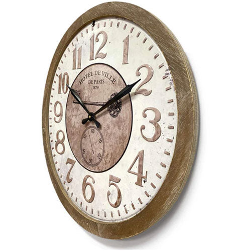 Ooit gedacht om een Parijse aanraking aan uw huis toe te voegen? Deze klok, met zijn metalen gezicht en houten grens, roept de elegantie op van een Franse hotellobby. Het ontwerp is perfect voor het creëren van een verfijnde en charmante sfeer, waardoor het een opvallende toevoeging aan je decor is.