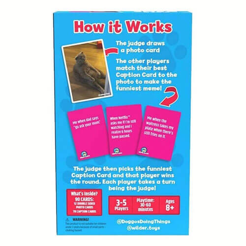 Tijd om te lachen! Kom samen met familie en vrienden om een aantal hilarische memes te maken. Om de beurt zijn de rechter als iedereen probeert de grappigste dierenmeme te maken met behulp van hun beste bijschriftkaart. Gegarandeerd een goede lach en geniet van een aantal echt grappige dierenfoto's.