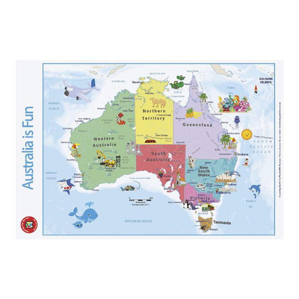 Dit leren kan een leuke wandgrafiek zijn, is dubbelzijdig en beschikt over een kaart van Australië die kleurrijk en aantrekkelijk is voor die van alle leeftijden. Het is veel in educatieve inhoud en opvallende afbeeldingen, die enkele van de meest iconische natuurlijke en culturele attracties en inheemse dieren van het land vertegenwoordigen. De achterkant heeft een lege kaart die perfect is voor een lagedrukkennisstest.