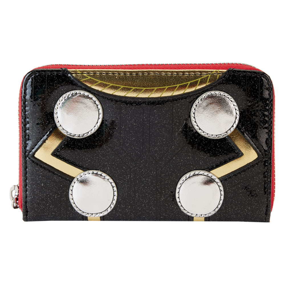 De loungefly marvel metallic thor cosplay rits rond portemonnee is gemaakt van veganistisch leer (polyurethaan). Wallet ritsen gesloten met glanzende zilveren hardware. Aanvullende functies zijn onder meer applique, debossed, glitter en gedrukte details. Let op de coördinerende binnenvoering.