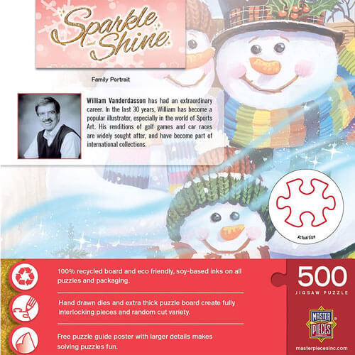 Deze meesterwerken 19 "x 19" 500 pc Holiday Glitter Puzzle is de perfecte manier om in de vakantie -geest te komen, en het perfecte kerstcadeau voor vrienden en familie. Een familie van sneeuwmannen maakt een behoorlijk portret. Dit prachtige kunstwerk wordt verbeterd met een glitterlaag om het een extra speciaal tintje te geven. Om de impact op onze omgeving te verminderen, is de in deze puzzel gebruikte spaanplaat van gerecycled materiaal gemaakt.