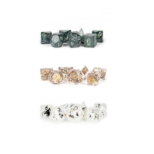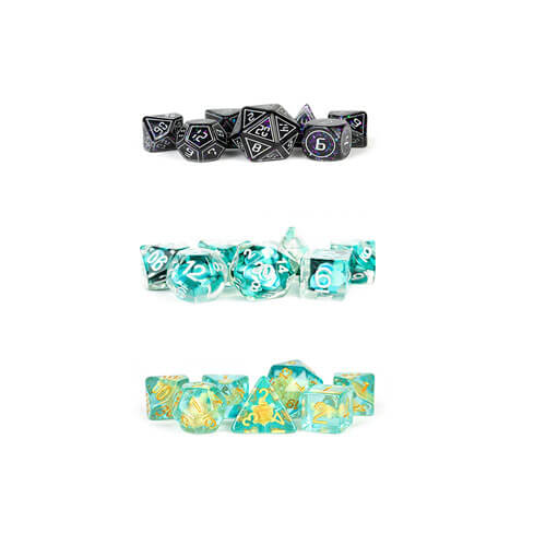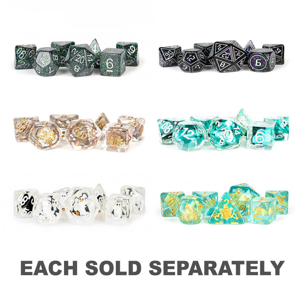 MDG -harsdobbelstenen hebben unieke insluitsels die flare toevoegen aan elke gamingtabel. Dit zijn volledige 16 mm polyedrale dobbelstenen sets die worden geleverd met 7 dobbelstenen (D4, D6, D8, D10, D10%(00-90), D12 en D20).