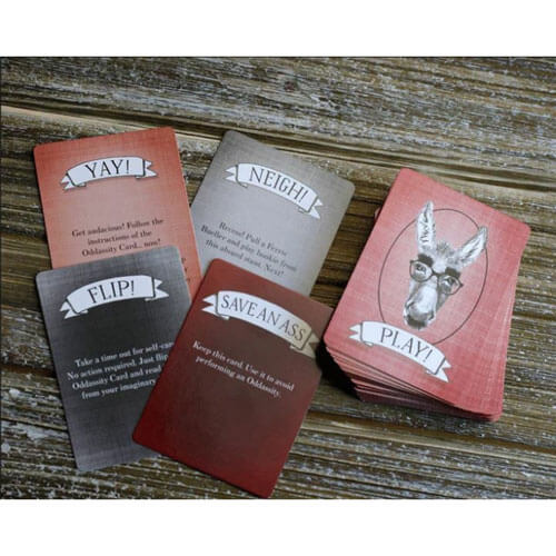 3 OddAssity -decks van 120 vreemde kaarten met steeds absurde beoordelingsniveaus: "NSFP" (niet veilig voor prudes), "NC" (heeft toestemming nodig) en "R" (Racy)