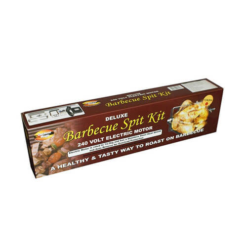 Deluxe Barbecue Spit Kit. Elektrische motor wordt beoordeeld tot 12,5 kg en heeft een roestvrijstalen warmteschild en automatisch achteruit voor bescherming tegen overbelasting. Pakken de meeste 3 tot 6 branderkap barbecues