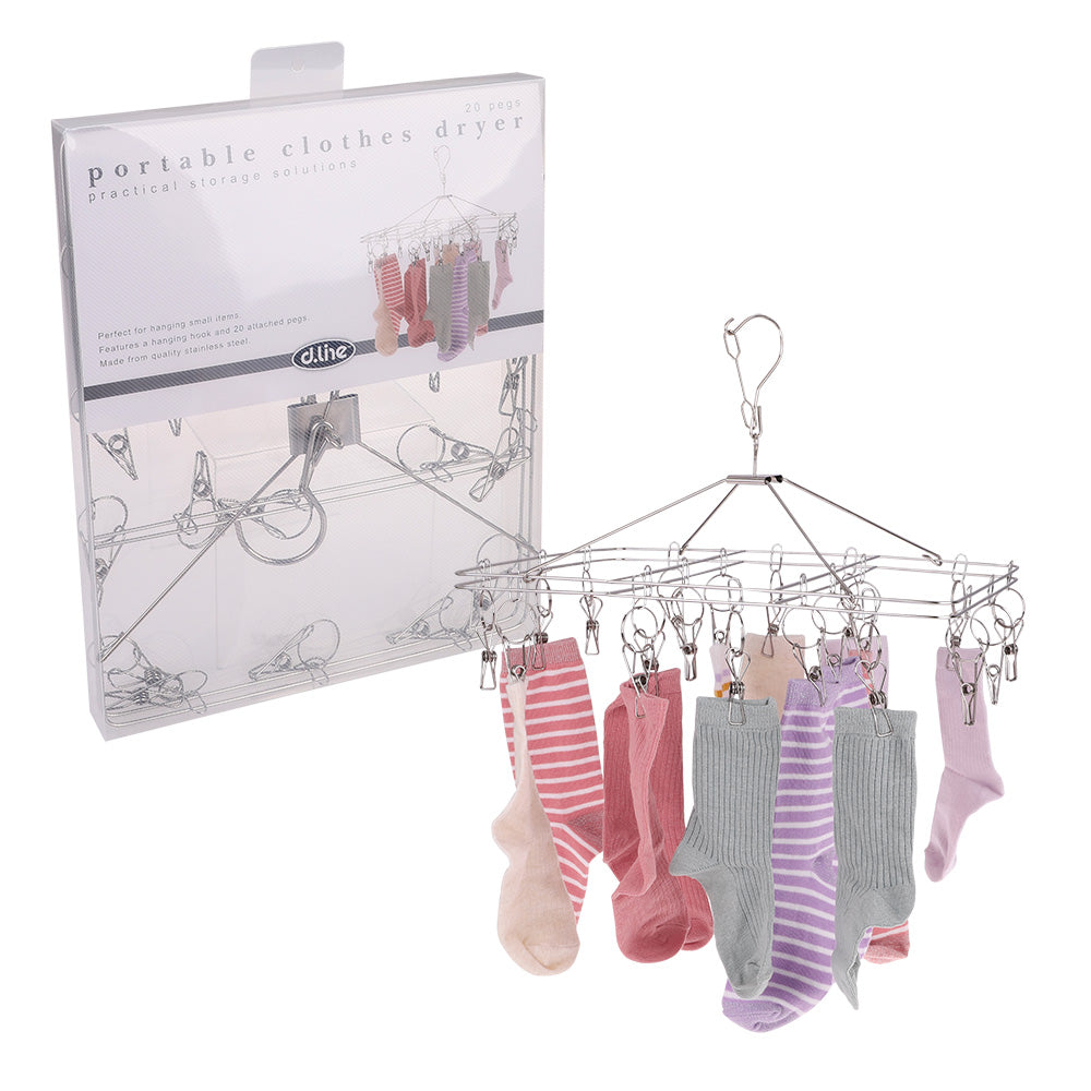 Deze roestvrijstalen rechthoekige kledingdroger - 20 haringen van D.Line zijn perfect voor het hangen van kleine items, zelfs in de meest compacte ruimte. Met een hangende haak en 20 bevestigde pennen, is deze compacte droger geweldig om te reizen en vouwt weg voor eenvoudige opslag.