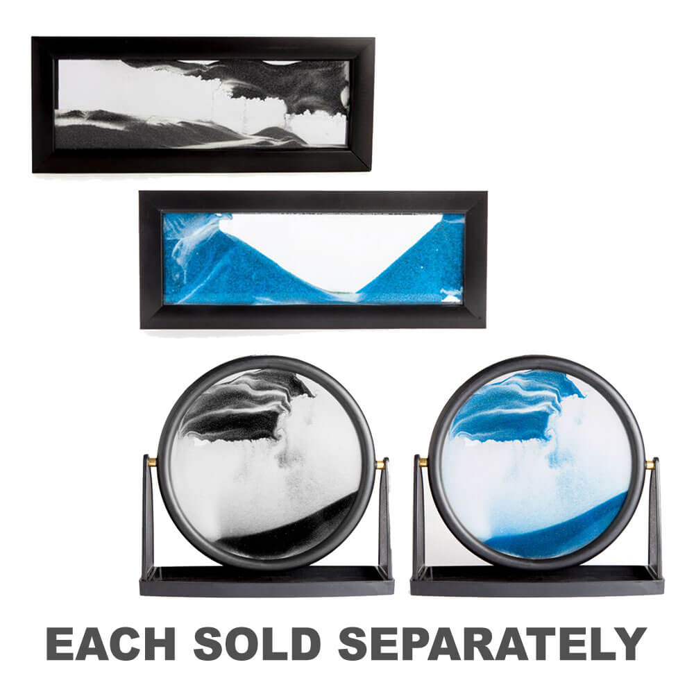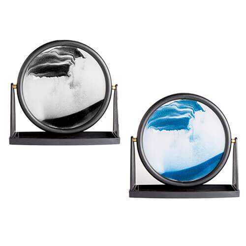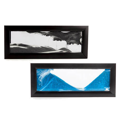 Onze zandframes zijn beschikbaar in blauw en zwart in twee stijlen - cirkel en rechthoek. Ze zijn eenvoudig te gebruiken zonder benodigde mechanische onderdelen of batterijen. Draai het frame gewoon om en de zwaartekracht doet al het werk! Het gekleurde zand wordt gemengd met een olieachtige vloeistof die het zand langzaam laat vallen en het zal betoverende patronen van wervelingen en wervelingen maken terwijl het van de bovenkant van het frame naar de bodem tuimelt. Het is moeilijk om je ogen ervan weg te scheuren!