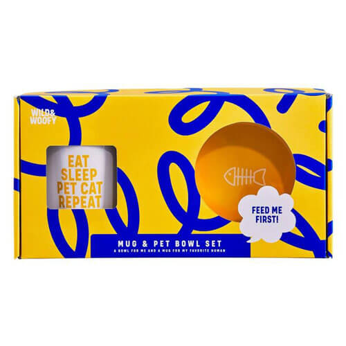 Een cadeau voor mij en een cadeau voor mijn favoriete mens! Deze kattenmok en kom van Wild en Woofy is het perfecte cadeau voor dat onafscheidelijke menselijke en kattenduo. Keramische mok en steenwerkkattencadeau. Mok leest 'Eat Sleep Pet Cat Repeated' en de kom leest 'Feed Me First'. Verpakt in oranje doos met blauwe veerafdruk.